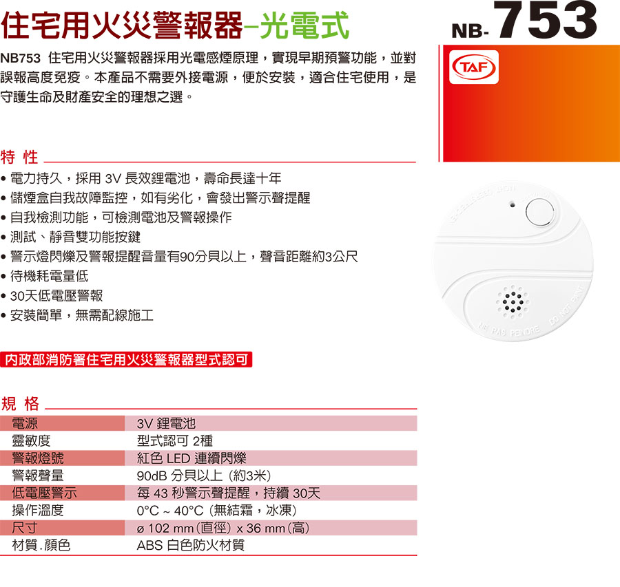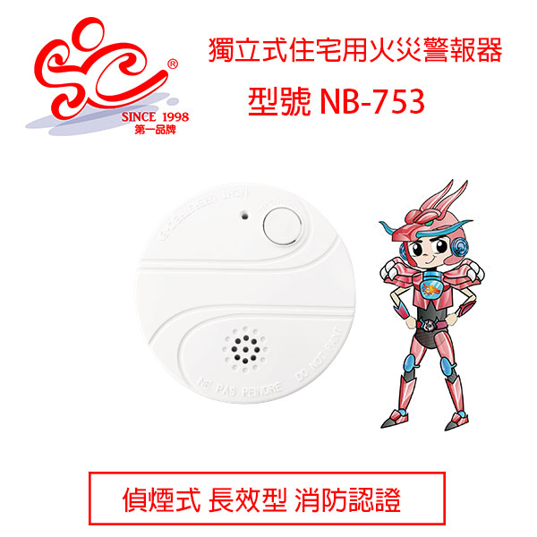 獨立式偵煙型警報器 住宅火災警報器(長效型電池) 型號:NB753